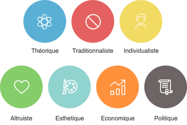 Notre Analyse des Forces Motrices mesure 7 facteurs de motivation, plutôt que les 6 dimensions issues des travaux d’E.Spranger. En établissant les raisons qui distinguent les dimensions « Politique » et « Individualiste », notre outil permet une plus grande finesse d’analyse.
